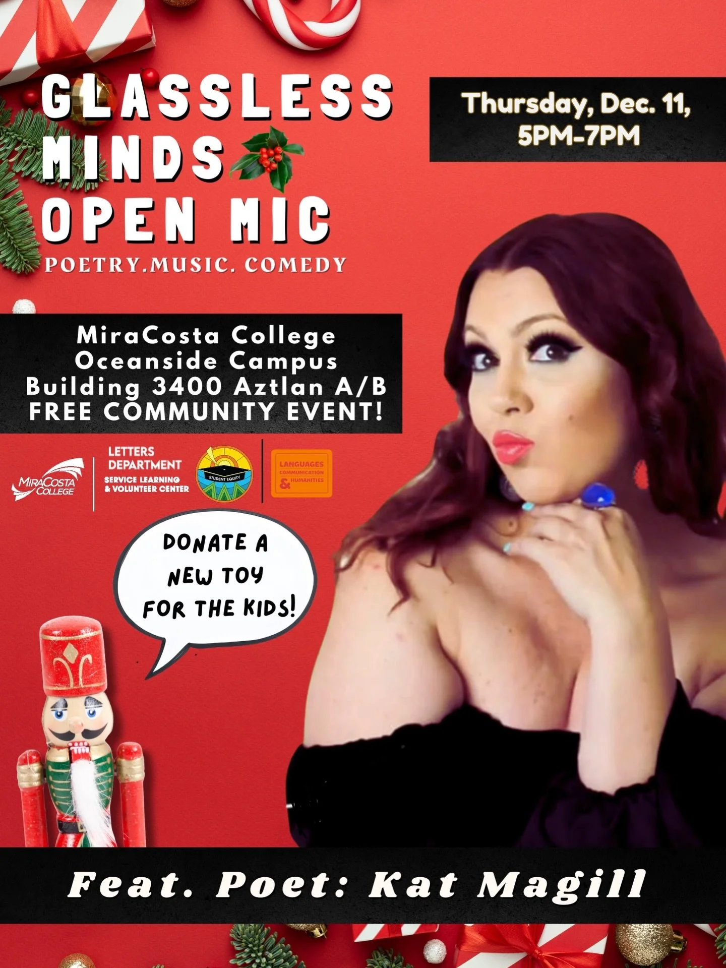 “Glassless Minds made me care about poems. My life is my life because of poems. The work that I’ve heard, the people I’ve met, the conversations I had out front after a show, Denny’s or burritos, I am forever grateful for. I never knew how supportive a community could be until I spent the Thursday’s of my adolescence in Oceanside with this brilliant group of humans. ”